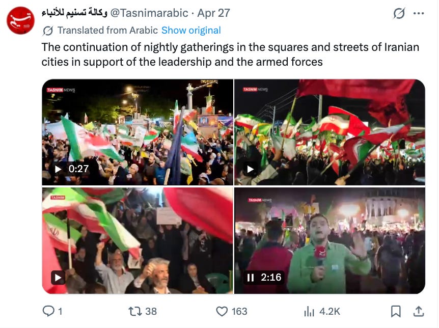 Alongside this, Iranian state media maintained continuous coverage of nightly rallies in Iranian cities, framed as popular support for the leadership and the armed forces. Tasnim Arabic carried footage from Revolution Square in Tehran with the caption “Iran of Imam Reza and the soldiers of Sayyid Mojtaba,” and parallel Persian-language framings across hardline papers connected Mojtaba to the religious legitimacy of Imam Reza. The mobilization apparatus is doing the same domestic-loyalty work the Houthis do with the Sarkha rallies, and the religious-genealogy framing is the same kind of move: locating regime authority in sacred lineage rather than in negotiated outcomes.