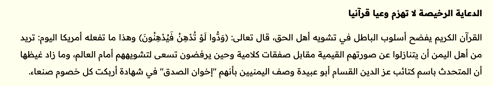 From there, Issa turned to Gaza. He constructed a narrative where the embassy's cartoon was timed in retaliation for Yemen's mobilization in support of Palestine. Only days earlier, Sanaa had orchestrated mass campaigns of solidarity with Gaza and against the disarmament of Hezbollah, revealing what he called the "religious and popular cohesion" of Yemeni society. Of course, measuring popular opinion is remarkably easy when dissent is met with detention or worse. In his logic, Houthis' success had unnerved Washington and its Gulf allies. And as proof, the clinching evidence was a statement from Abu Ubaida, spokesman of Hamas's al-Qassam Brigades, who a month earlier had praised Houthis as "إخوان الصدق" or "brothers of sincerity." That endorsement, Issa argued, struck fear into Washington. The cartoon, from his point of view, was nothing more than a petty reprisal: America lashing out not because of drugs, but because Yemen had been elevated in the eyes of the Palestinian resistance.