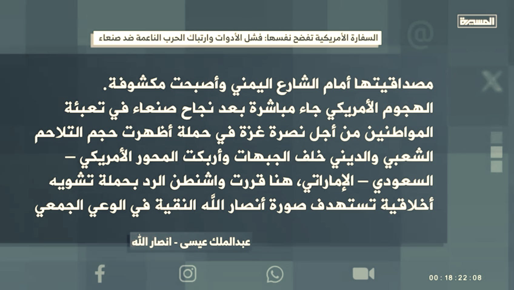 A critique appeared on their official website (Ansar Allah), authored by Abdelmalek Issa and titled “The American Embassy Exposes Itself: Failure of Tools and Confusion of Soft War Against Sanaa”, and covered by Houthi media TV broadcast channels, including al-Masirah. This was no ordinary respondent. His professional title -Dean of the Faculty of Arts and Humanities at the University of Sanaa- may suggest scholarly objectivity, but Issa is reportedly the brother-in-law of Abdelmalik al-Houthi, the movement's leader. His blood ties confer legitimacy, a reminder of how family and ideology fuse in movements like the Houthis.