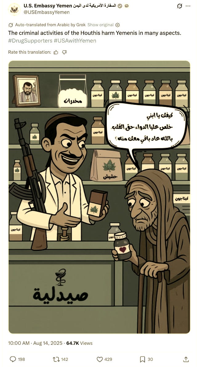 This was the U.S. Embassy's own attempt at public messaging; a crude, AI-generated cartoon image, but deliberate communication designed to expose the Houthis. The U.S. Embassy wasn't wrong about the substance; the Houthis have been deeply enmeshed in narcotics trafficking, particularly the lucrative Captagon trade. Left on its own, however, the AI-generated cartoon would probably have garnered a few reshares and disappeared into digital noise. But within twenty-four hours, the Houthis made it clear that they were watching.