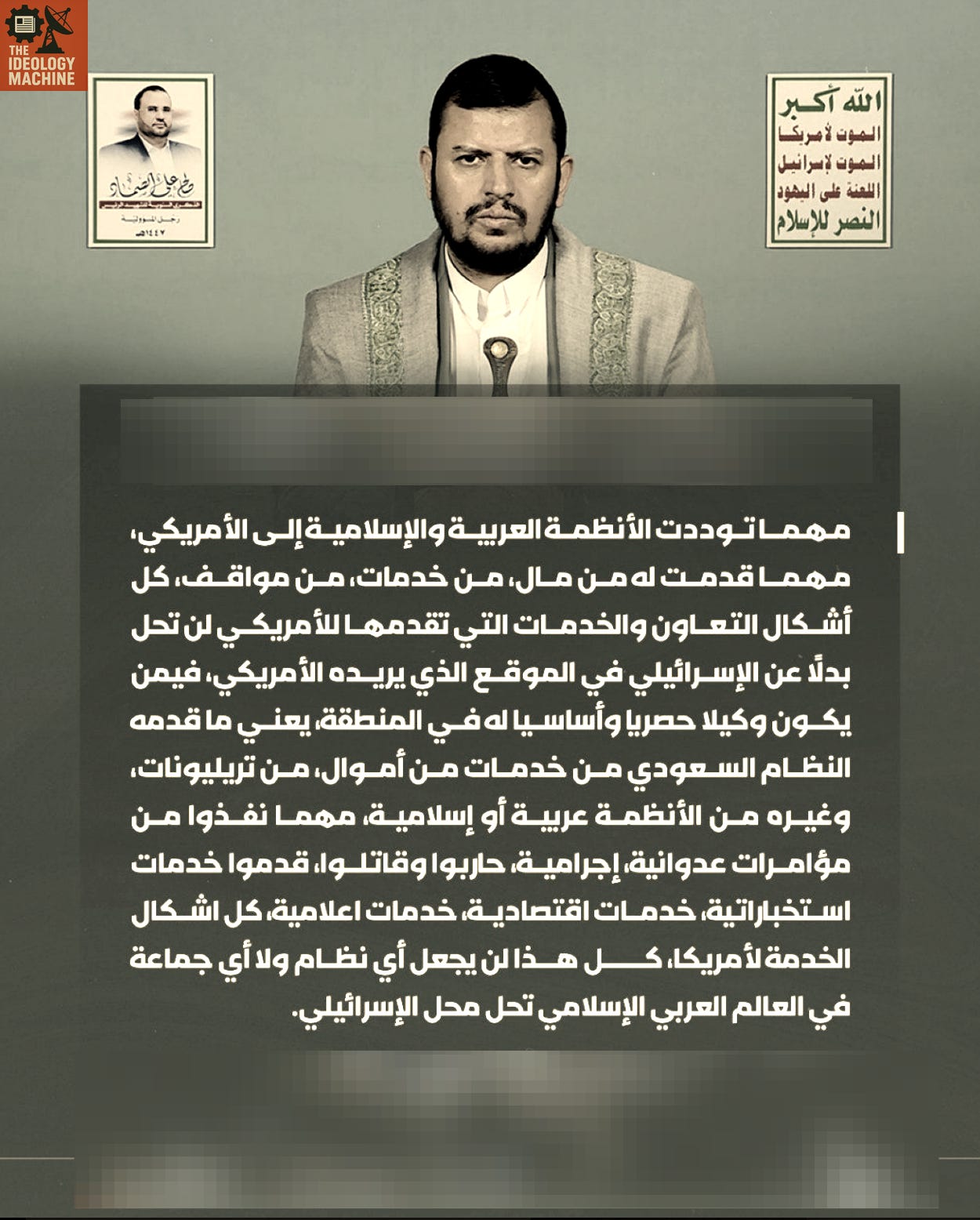 The first part of the speech is what most analysts tune out. It’s also where the real work is being done. Abdul-Malik frames the conflict as a unified front against a single “US–UK–Israeli” axis (محور أمريكي بريطاني إسرائيلي). Gaza and Yemen become chapters in the same story. The struggle is civilizational: “الغرب الكافر” (the infidel West) versus the faithful.