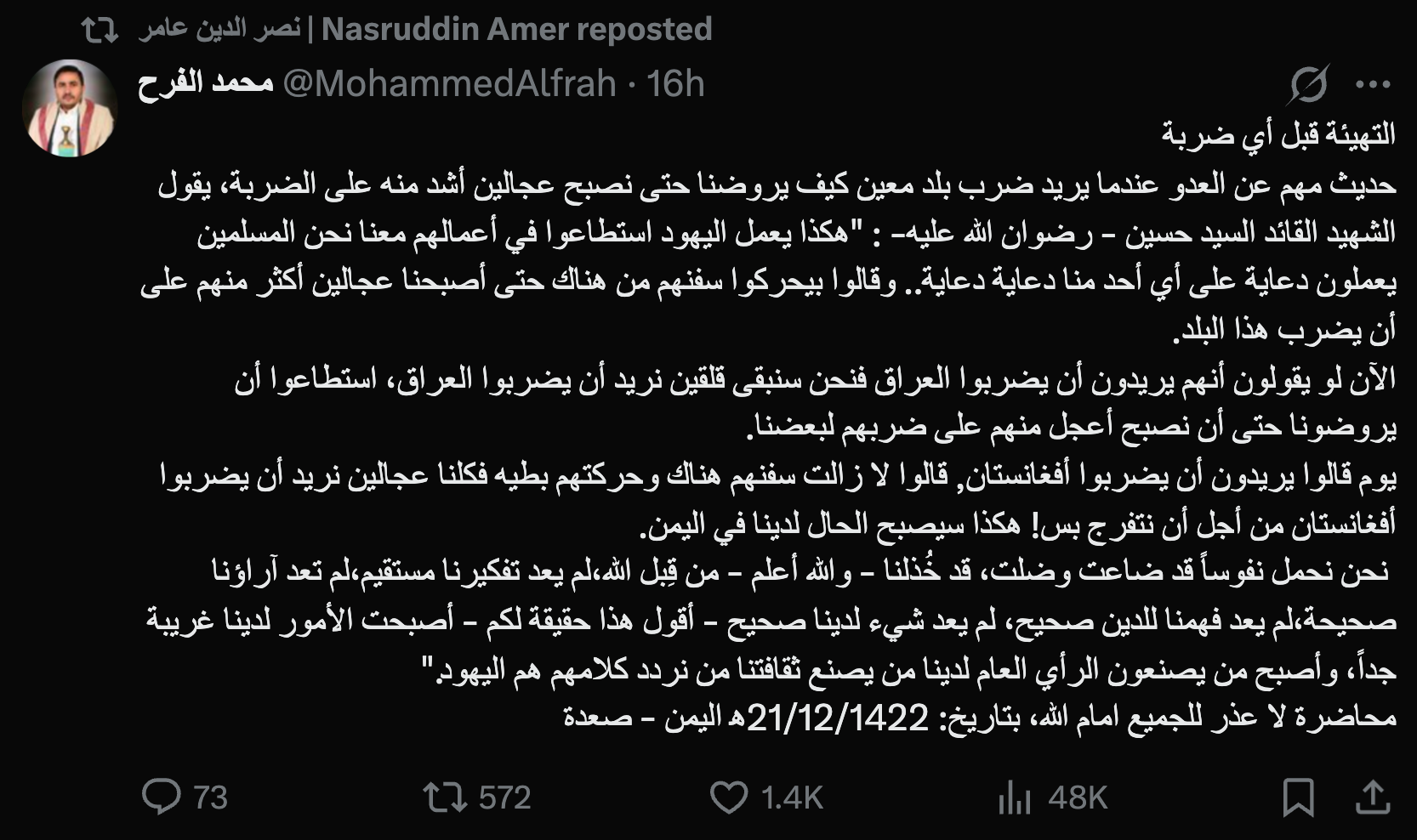 In his article “The Repetition of Ruin: American Aggression Is Not a Whim but an Open-Ended Zionist Project,” Mohammed al-Farah, a member of the Houthi political bureau, frames a prospective U.S. military response to Iran as part of an entrenched American war project. By drawing parallels to Afghanistan and Iraq, he presents escalation as a recurring regional pattern. An attack on Iran becomes a pivotal moment requiring ردّ جماعي (collective response), with Iran’s defense treated as a shared obligation.