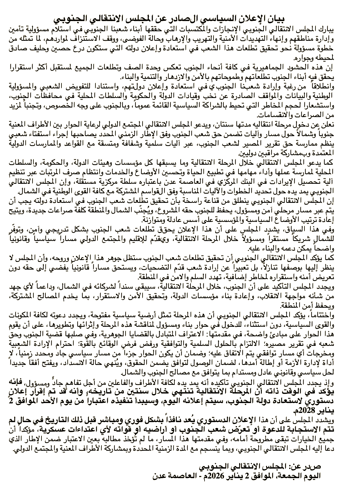 Today, January 2, 2026, STC leader and Presidential Leadership Council (PLC) member Aidarous al-Zubaidi announced in a televised address a timed, conditional pathway to statehood: a two-year transition, a referendum, an invitation to the international community, and a constitutional declaration set for implementation on January 2, 2028. He included a tripwire clause; that the Southern constitution takes effect immediately if Southern forces face military aggression. The structure is designed to project legitimacy and restraint. Whether it achieves either is another question.