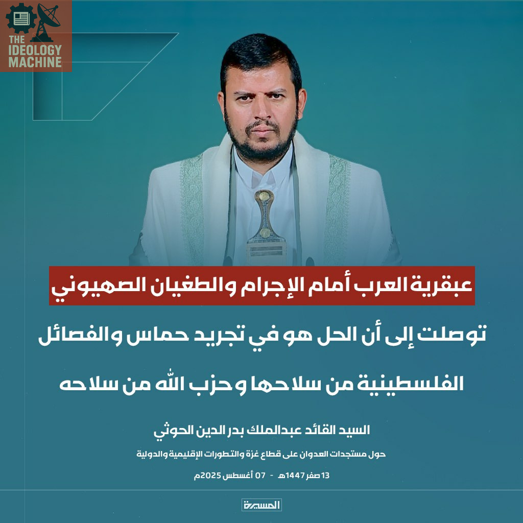 Abdulmalek al-Houthi, August 7, 2025, derided Arab leaders whose “solution” to Zionist aggression is to strip Hamas, Palestinian factions, and Hezbollah of their weapons. The image is downloaded from Houthi TV media channel.