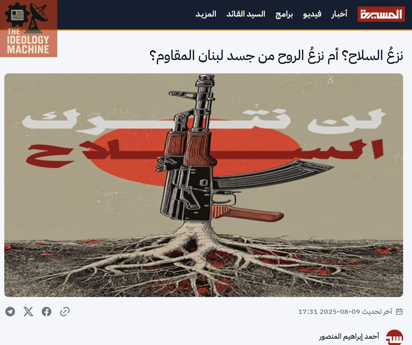 The escalation was systematic. Shaher Ahmed Ameer, writing for Houthi media, warned that "the decision to withdraw Hezbollah's weapons means practically exposing Lebanon to Israeli ambitions, and turning it into a previous target as happened in Syria." Al-Masirah analyst Abd al-Manan al-Sanbali posed the question directly: "Disarming Hezbollah: A national decision or a conspiracy?" before providing the answer: "The resistance's weapons are Lebanon's honor." The avalanche of coordinated messaging left no room for nuance - complex political questions had been reduced to existential binaries.